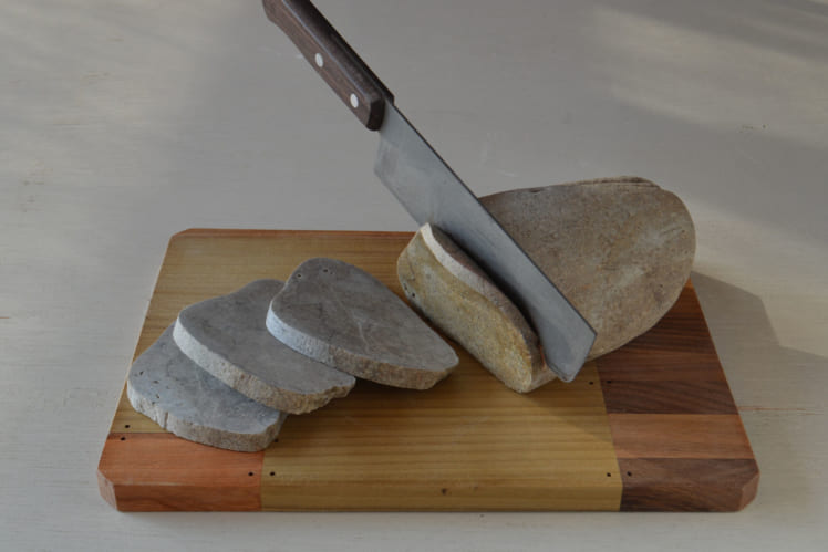 母が実家で使わなくなった古い包丁を、最初の作品に使いました。石の塊を包丁で料理するように切った作品があって、異素材と組み合わせたのはそれが初めてでした。